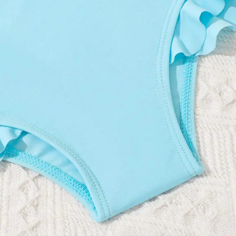 The soft, stretchy fabric feels gentle against delicate skin, while the playful ruffle detailing adds a charming finishing touch. Ideal for beach holidays, pool days, or sunny getaways, this set is as functional as it is adorable.