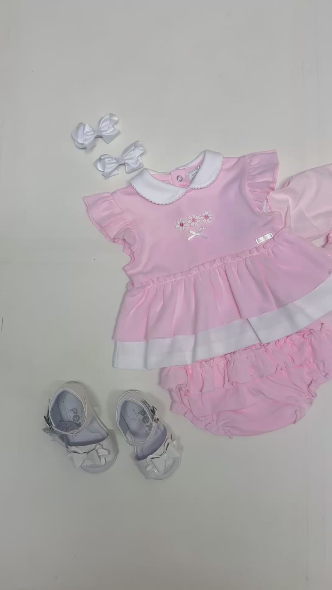 Crafted in a soft pastel pink, this charming piece features delicate frill sleeves, a classic Peter Pan collar, and sweet floral embroidery with a bow detail at the chest. The layered skirt creates a graceful dress effect, while the integrated bloomers ensure comfort, coverage, and easy movement for little ones.