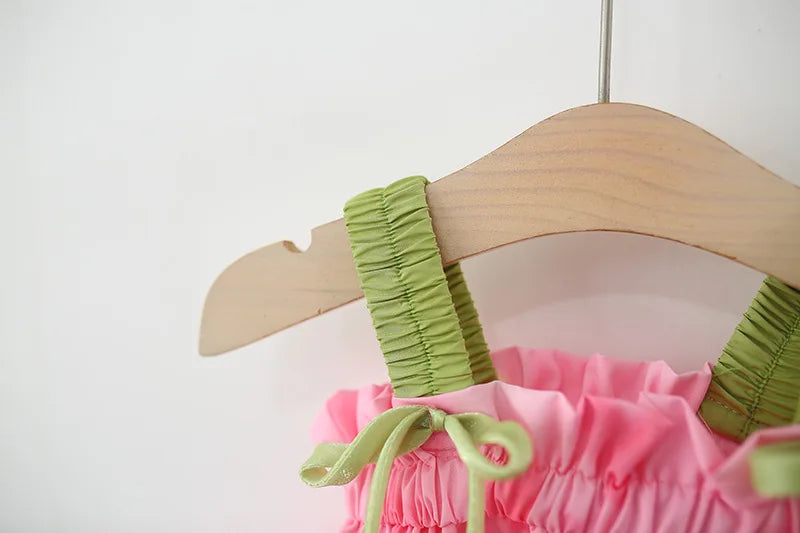 The Blush Heart Ruffle Set features a beautifully layered top with soft ruffle detailing, delicate tie accents, and subtle decorative tassels, paired with matching shorts in a coordinating heart print. The gentle blush tones combined with soft pops of colour create a light, joyful look perfect for warmer days.