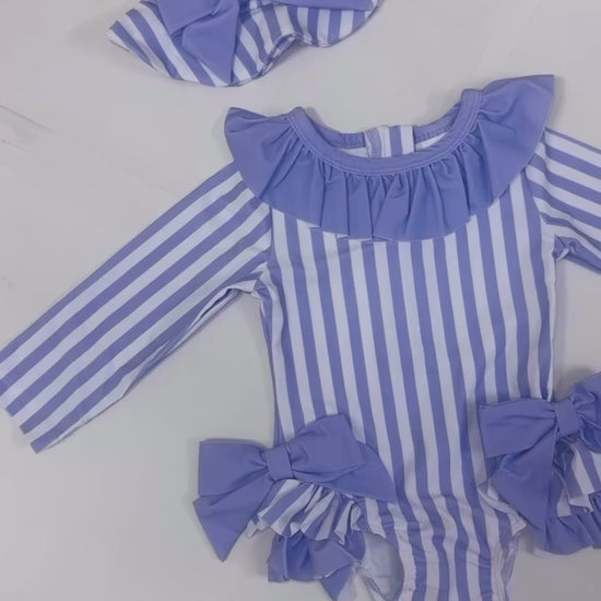 The full swimsuit features long sleeves for added coverage and comes with a matching hat, creating a complete swimwear set that is both comfortable and easy to wear. Finished in a soft lilac pin-striped design, it offers a gentle, timeless look suited to little ones from newborn to 3 years.