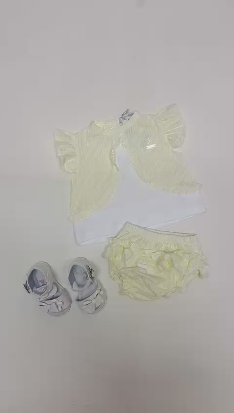 This adorable two-piece baby set features a soft yellow gingham top with flutter sleeves and a pretty frill edge, layered over a white vest for a sweet, summery look. The matching gingham bloomers are finished with delicate ruffle detailing for added charm. Lightweight and breathable, this set is perfect for warm days, special occasions or everyday wear.