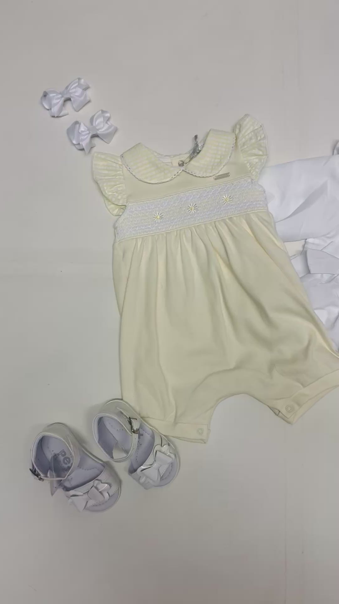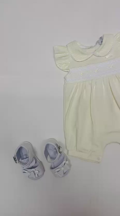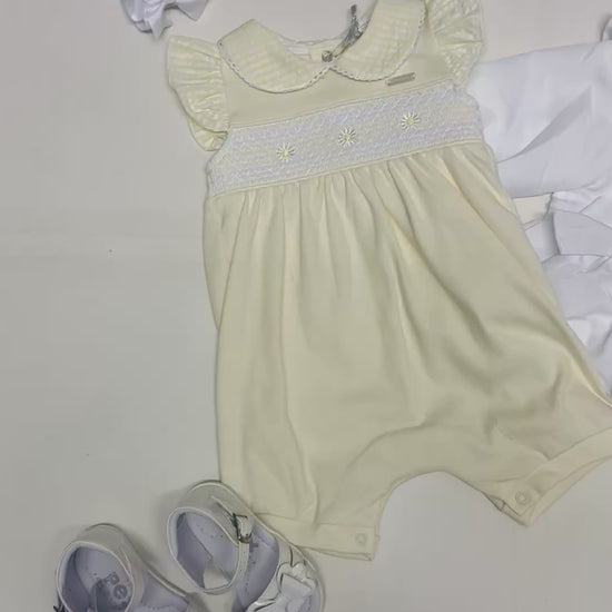 This beautifully crafted baby romper features delicate yellow smocking across the chest with subtle embroidered detailing. Finished with flutter frill sleeves and a classic rounded collar, it offers a timeless and elegant look. Soft and lightweight, this romper is ideal for warm days, special occasions or a refined everyday outfit.