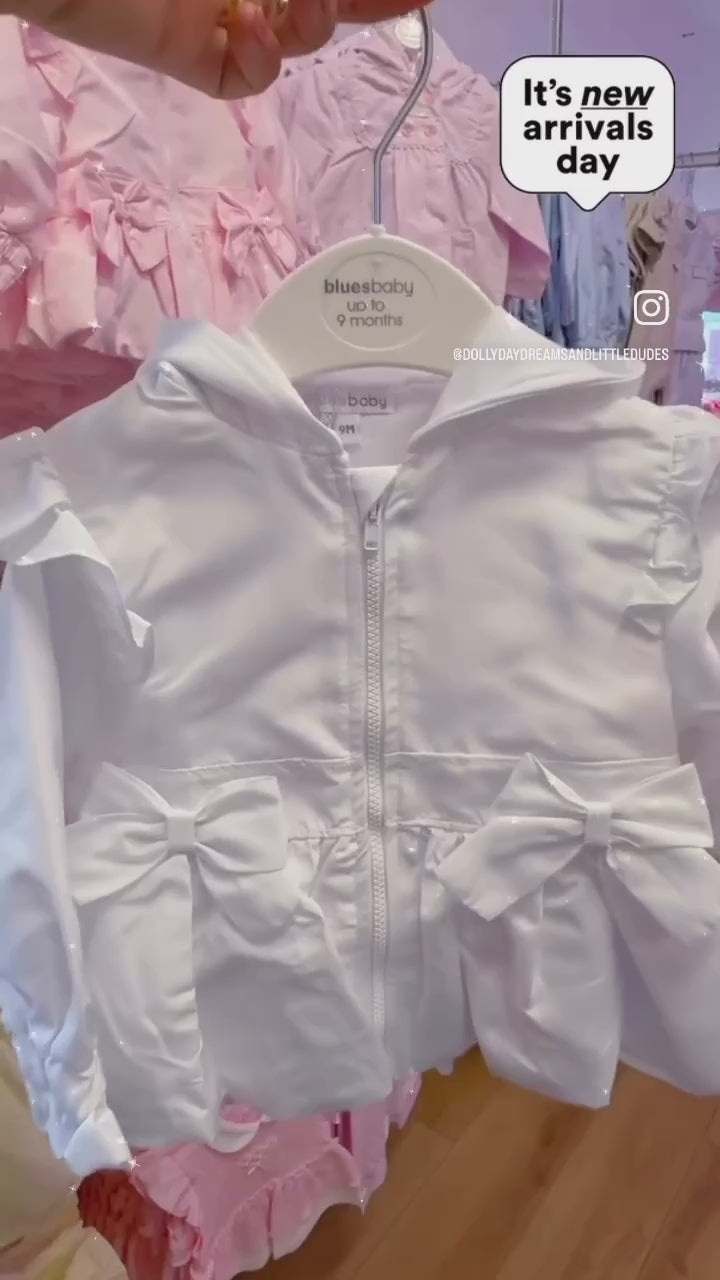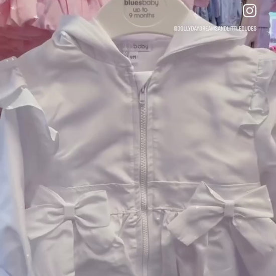 This beautiful white baby jacket is designed with soft frill detailing and charming bow accents for a timeless, elegant look. Featuring a cosy hood, elasticated cuffs and a full front zip, it offers both comfort and practicality. The gently flared shape adds a stylish finish, making it perfect for special occasions or everyday wear. A delicate layering piece for keeping little ones warm in style.