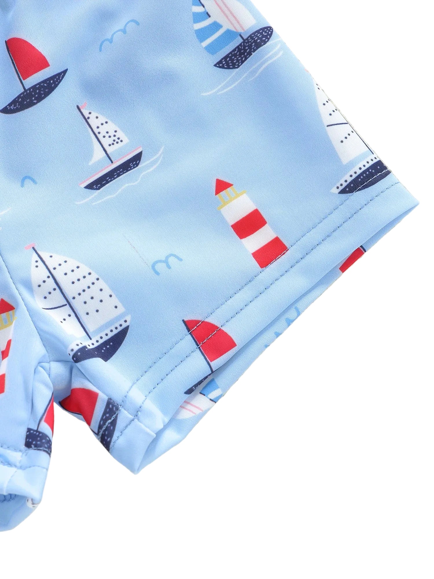 A fun and practical swimwear set designed for sunny adventures. This boys boat print swim set includes a short-sleeve swim top, matching swim shorts, and a coordinating sun hat for all-day comfort and protection.