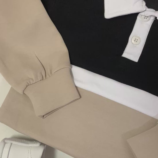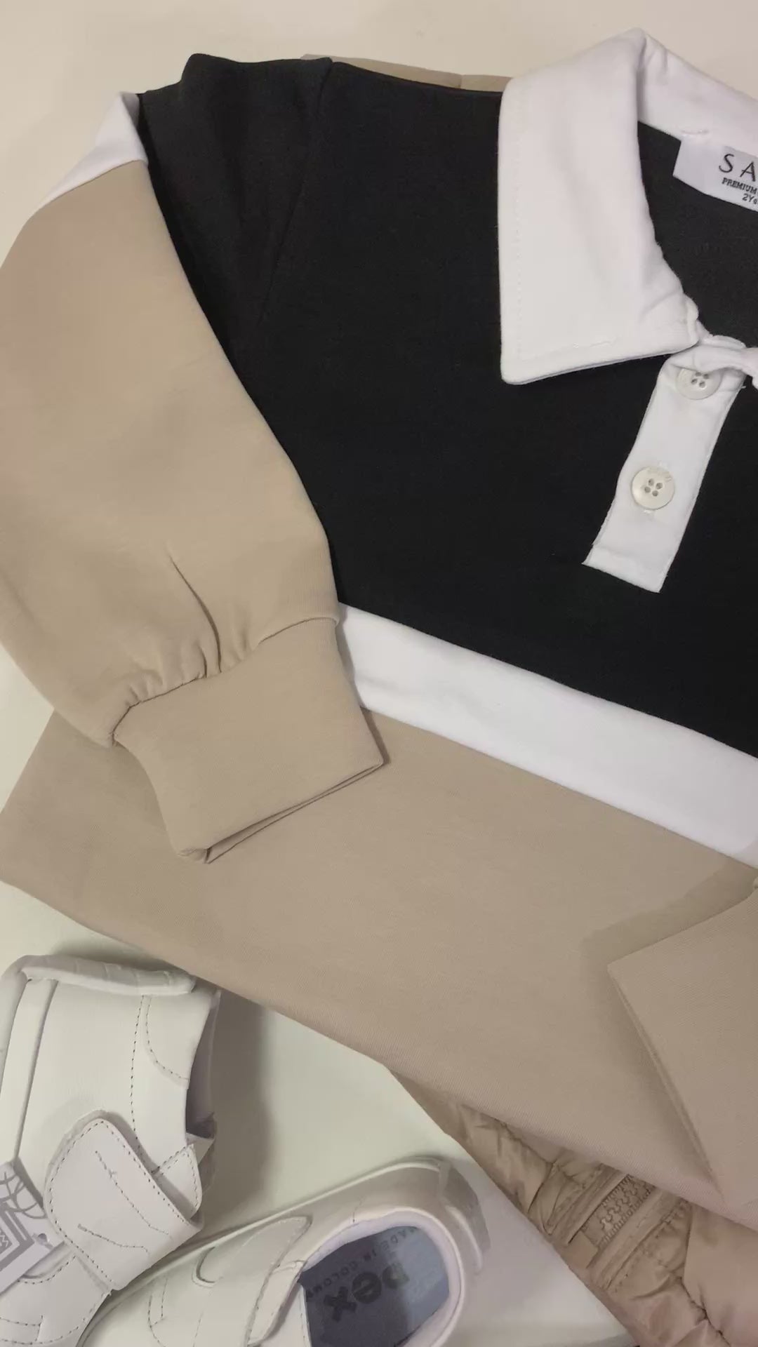 Boys three-tone black, white and beige buttoned collar long sleeve top co-ord with matching trousers set.