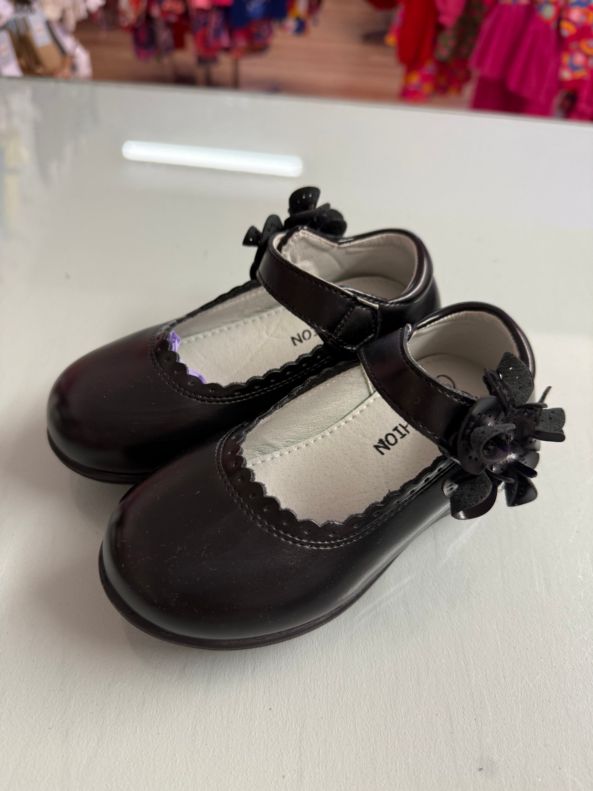 Girls Black School Shoes Flower