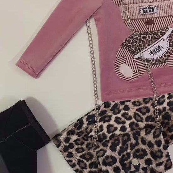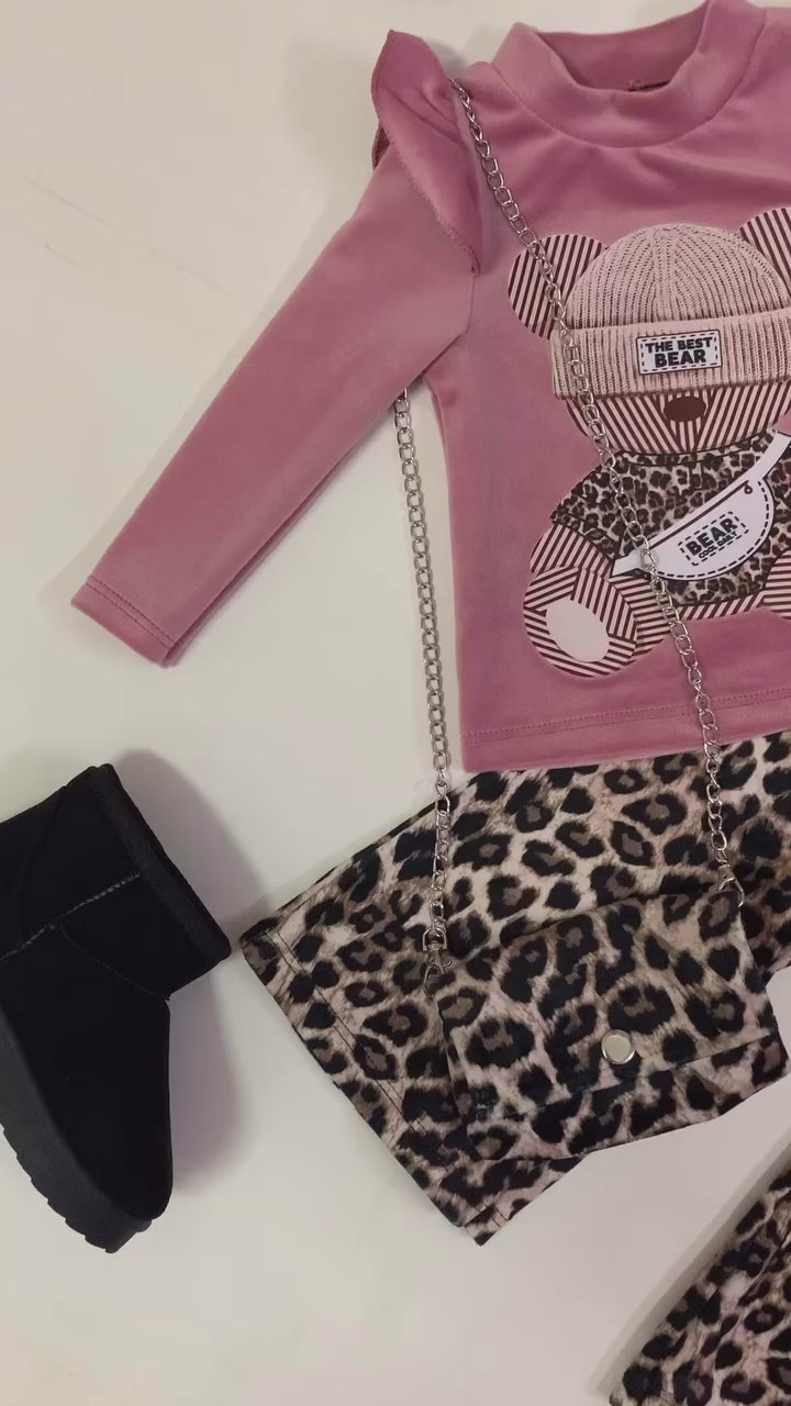 Girls pink long sleeve teddy print top co-ord with matching black leopard trousers & bag.