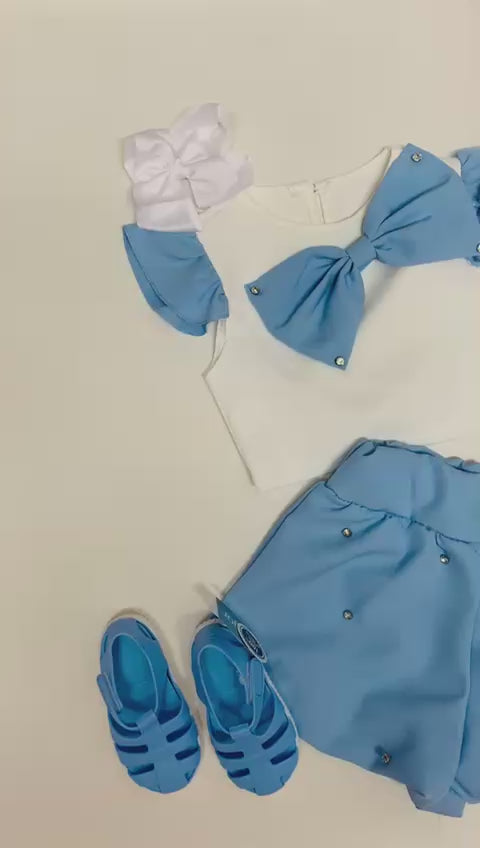 Kids sky blue & white bow pearl sequin top co-ord with matching pearl sequin skort set.