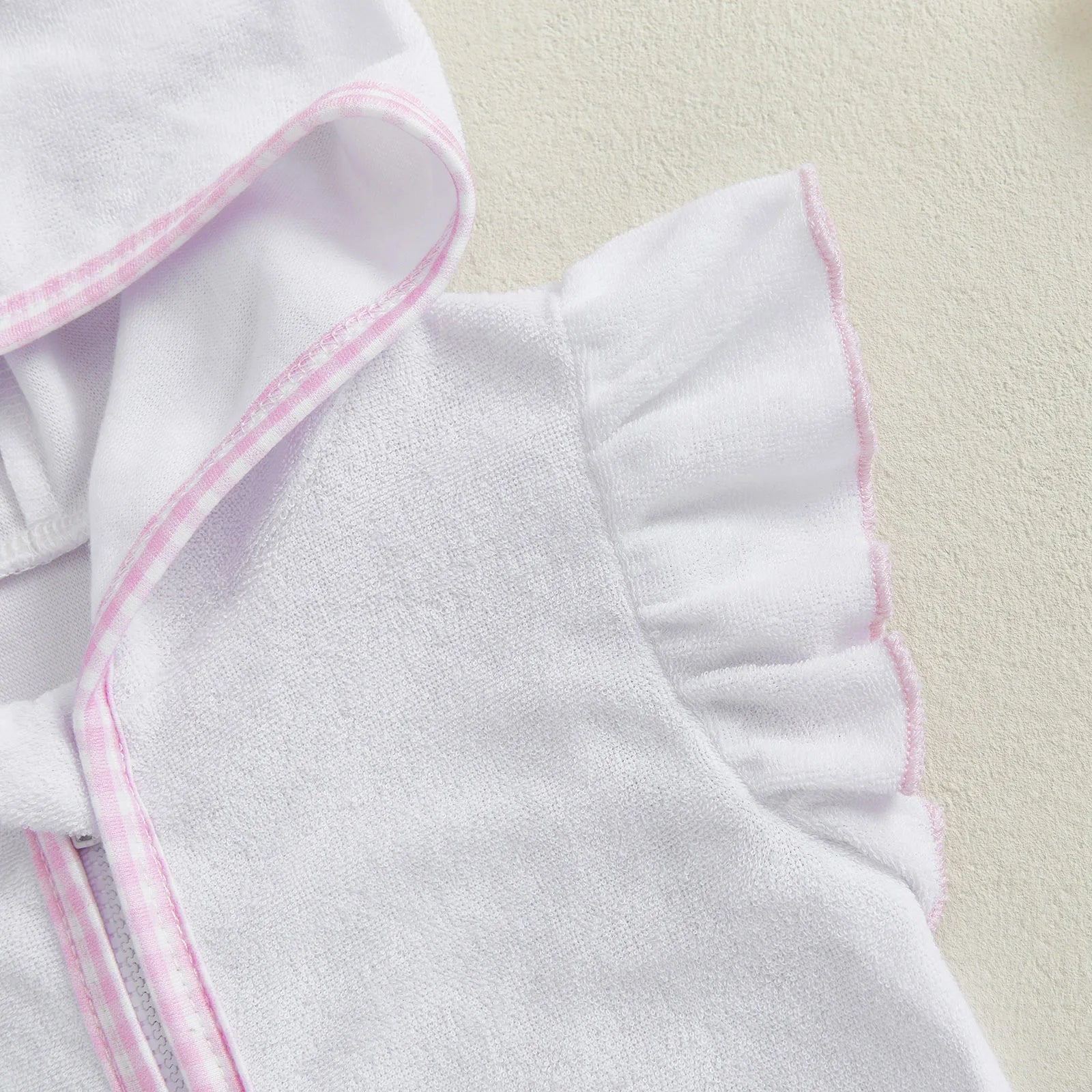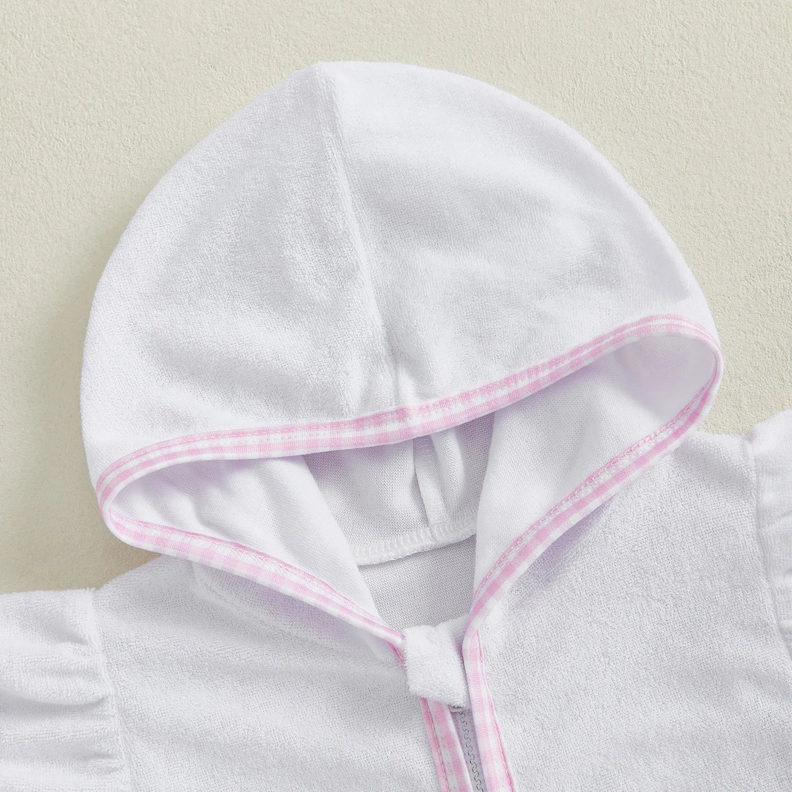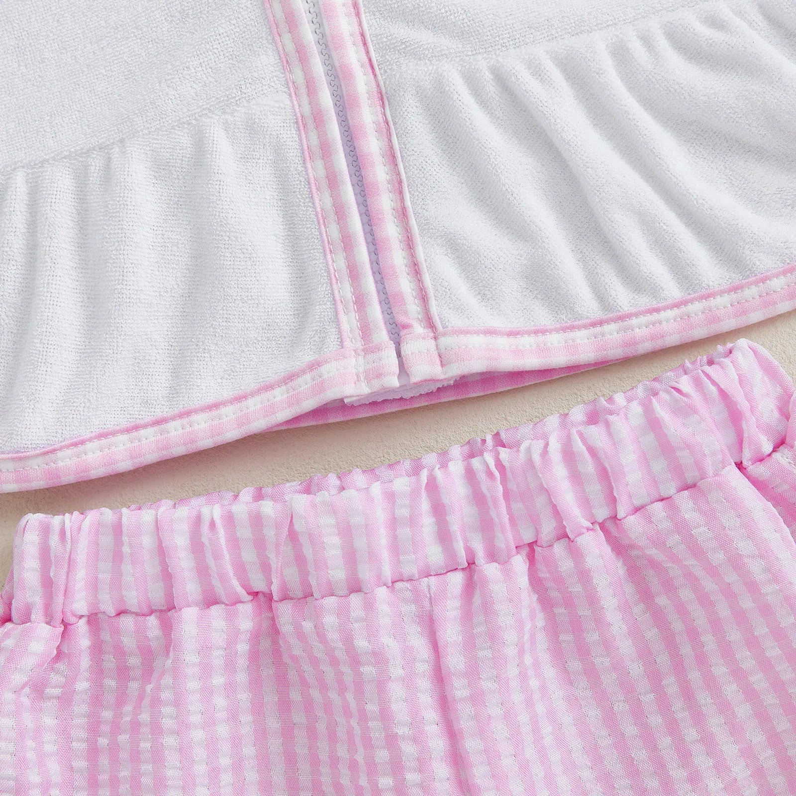 The set includes a white short-sleeve zipper hood top and ruffled pink plaid shorts, providing lightweight coverage and freedom of movement for active little girls. Designed for ages 1–5 years, it’s ideal for poolside play, beach trips, or casual summer outings.