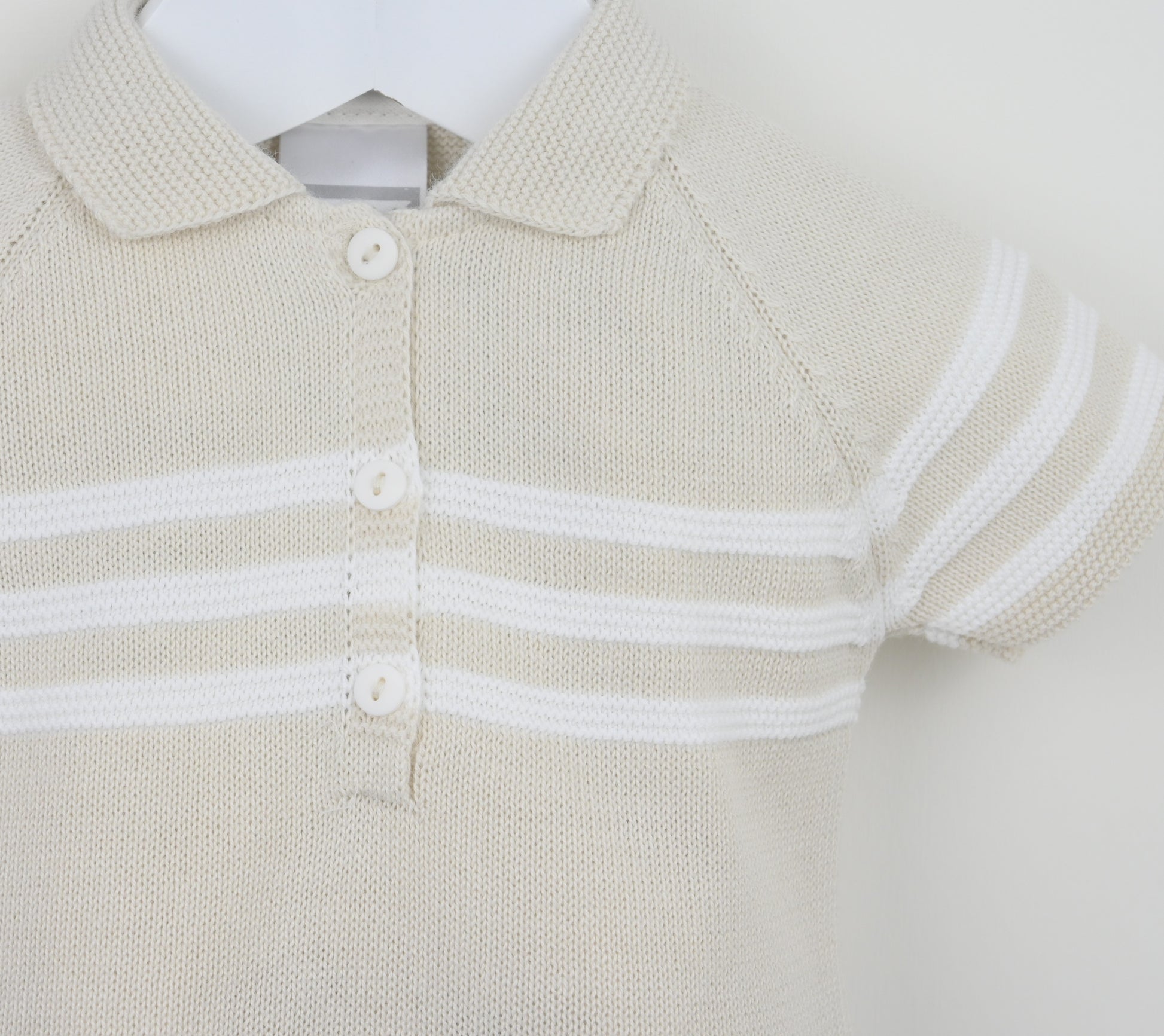 A timeless and understated knitted romper in a soft natural tone, designed with classic polo styling for a smart yet comfortable look. This beautifully crafted piece features short sleeves, a traditional knitted collar, and delicate contrast stripe detailing across the chest and sleeves.