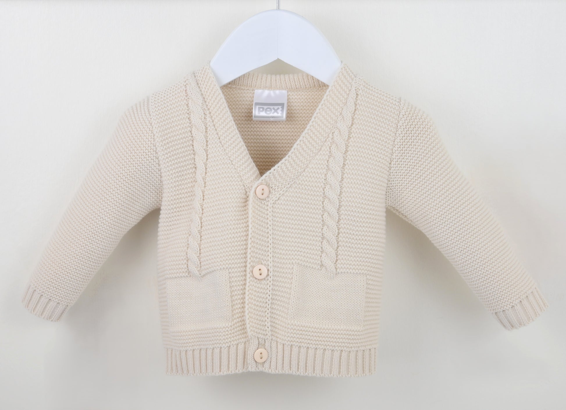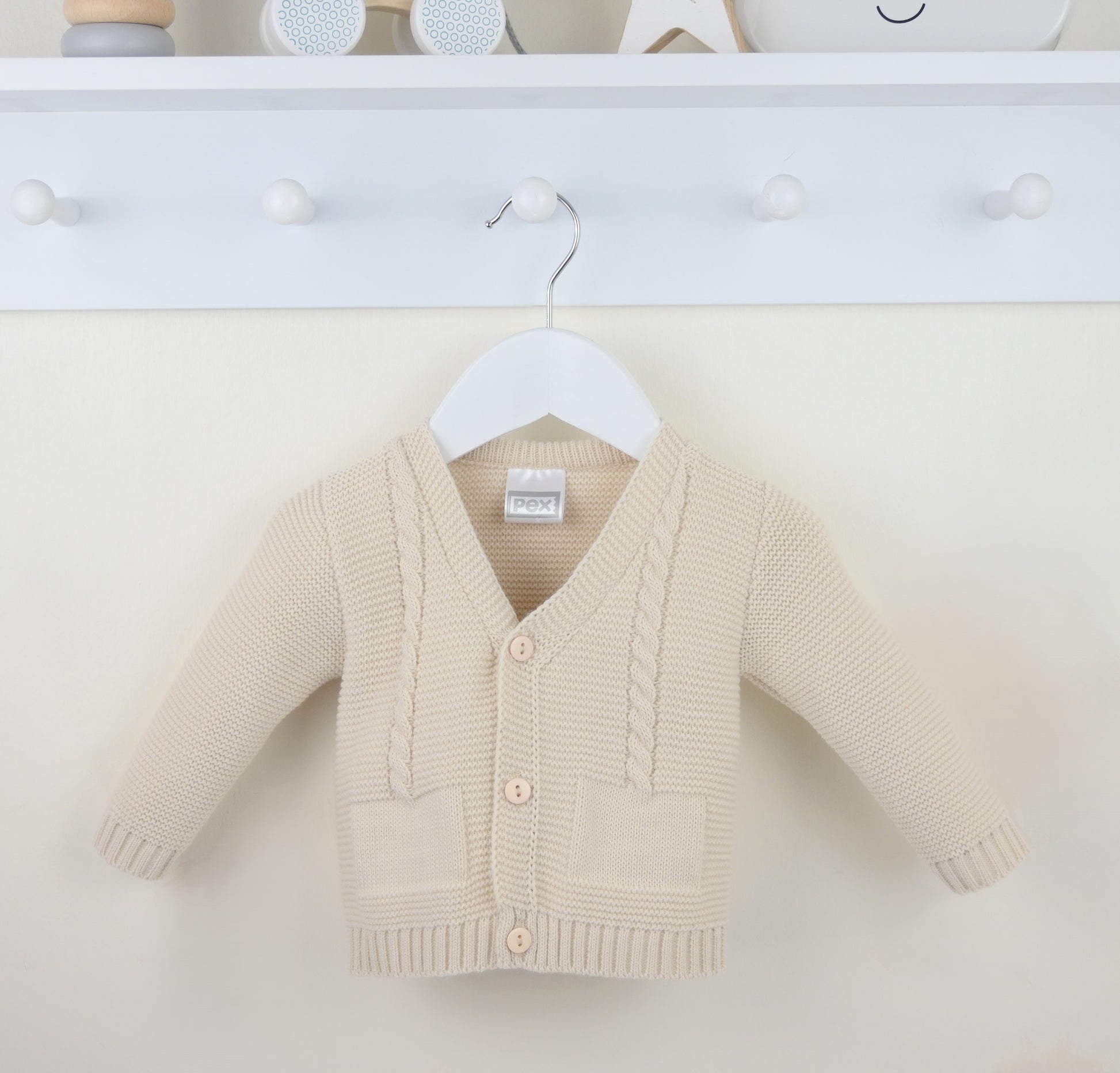 This classic natural knitted cardigan is a timeless essential for little ones from newborn to 24 months. Crafted in a soft, finely textured knit, it features a traditional V-neck design with delicate cable detailing along the front panels for a refined finish.