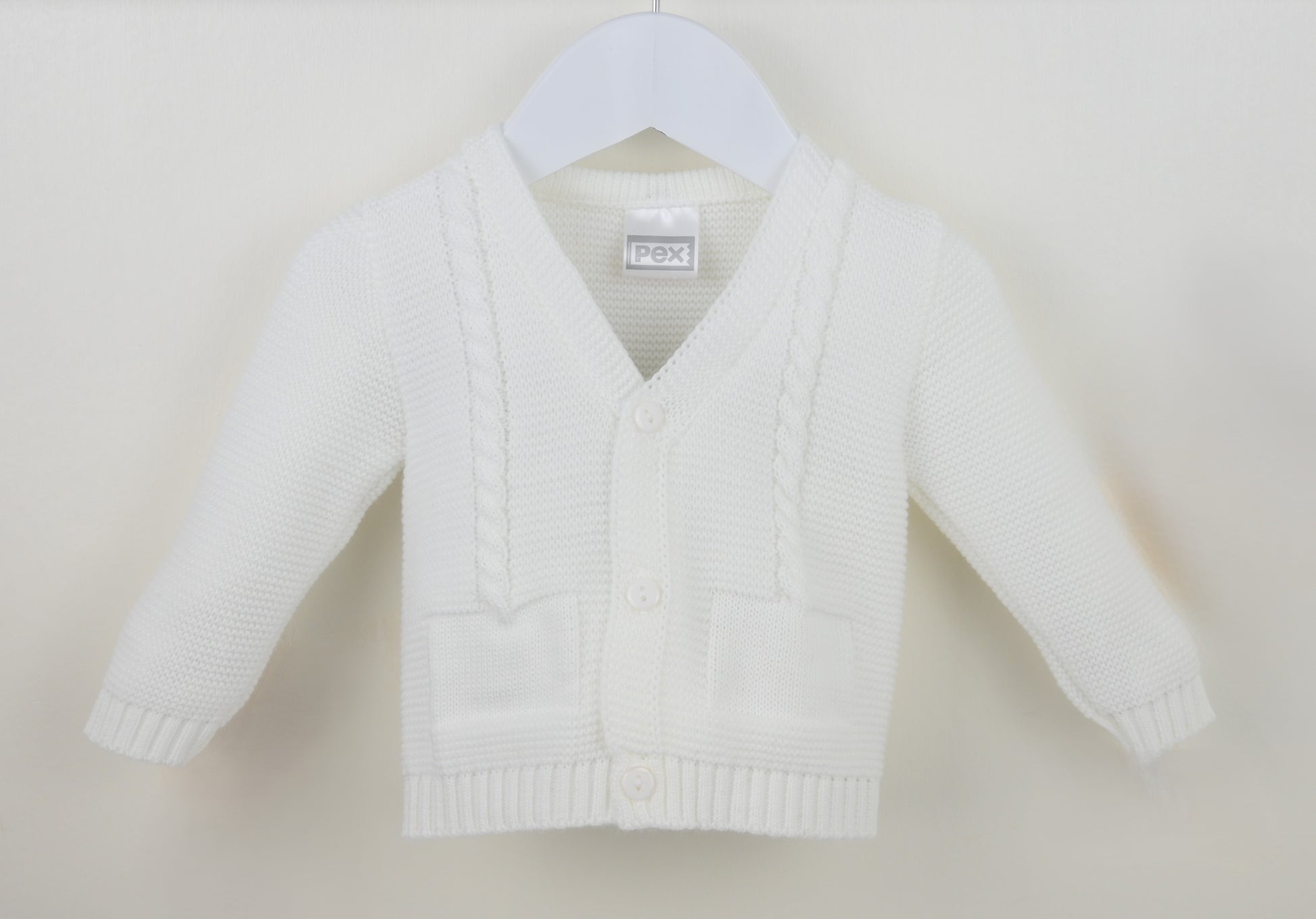 This classic white knitted cardigan is a timeless essential for little ones from newborn to 24 months. Crafted in a soft, finely textured knit, it features a traditional V-neck design with delicate cable detailing along the front panels for a refined finish.