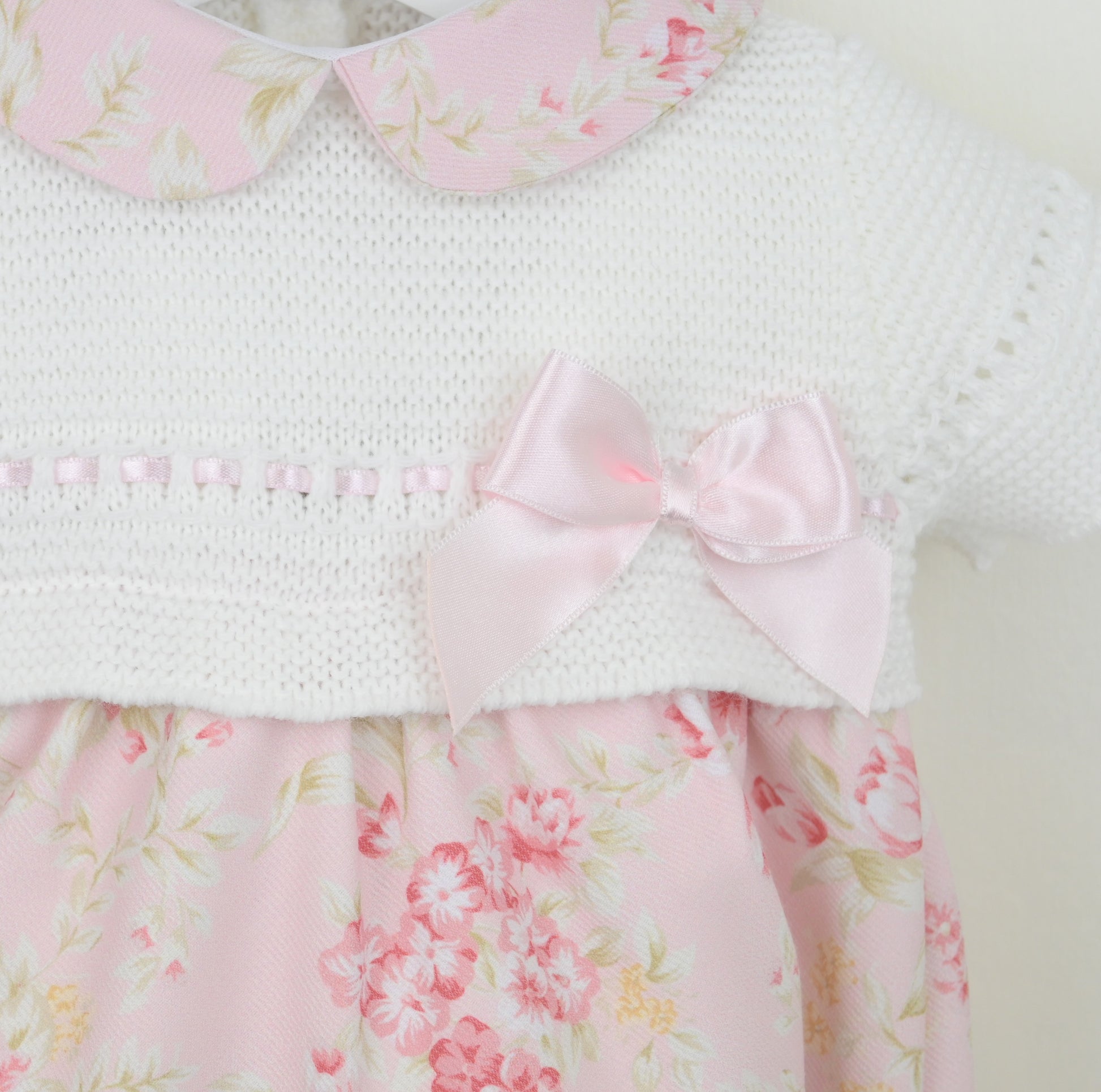 The lower half showcases a soft pink floral fabric, perfectly coordinated with the collar for a refined, traditional look. Gentle elasticated leg openings ensure a comfortable fit while allowing ease of movement, making this romper ideal for special occasions, family outings, or everyday luxury wear.