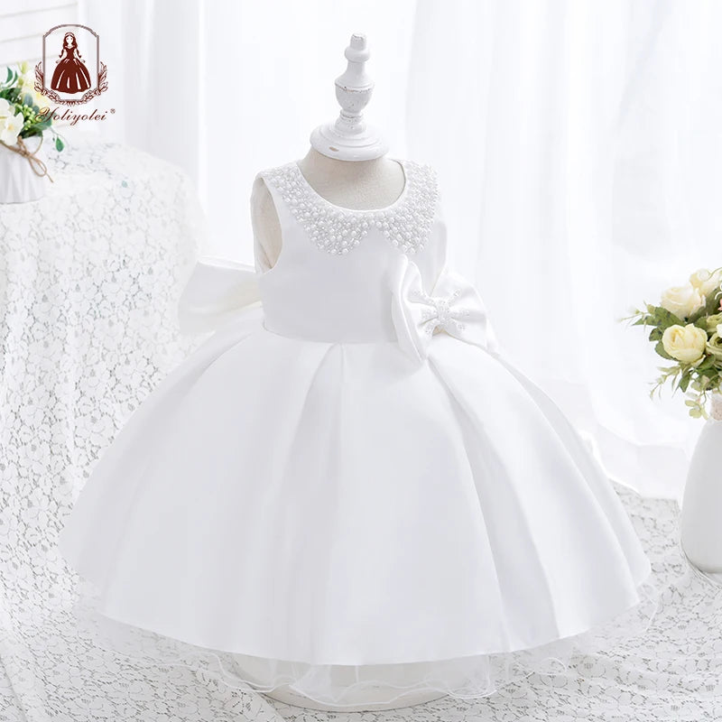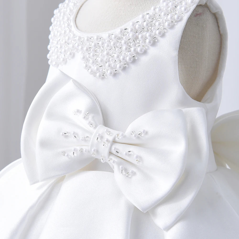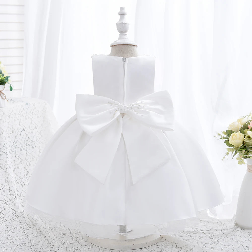 Baby girls white christening dress, complete with diamonets and bow finish.