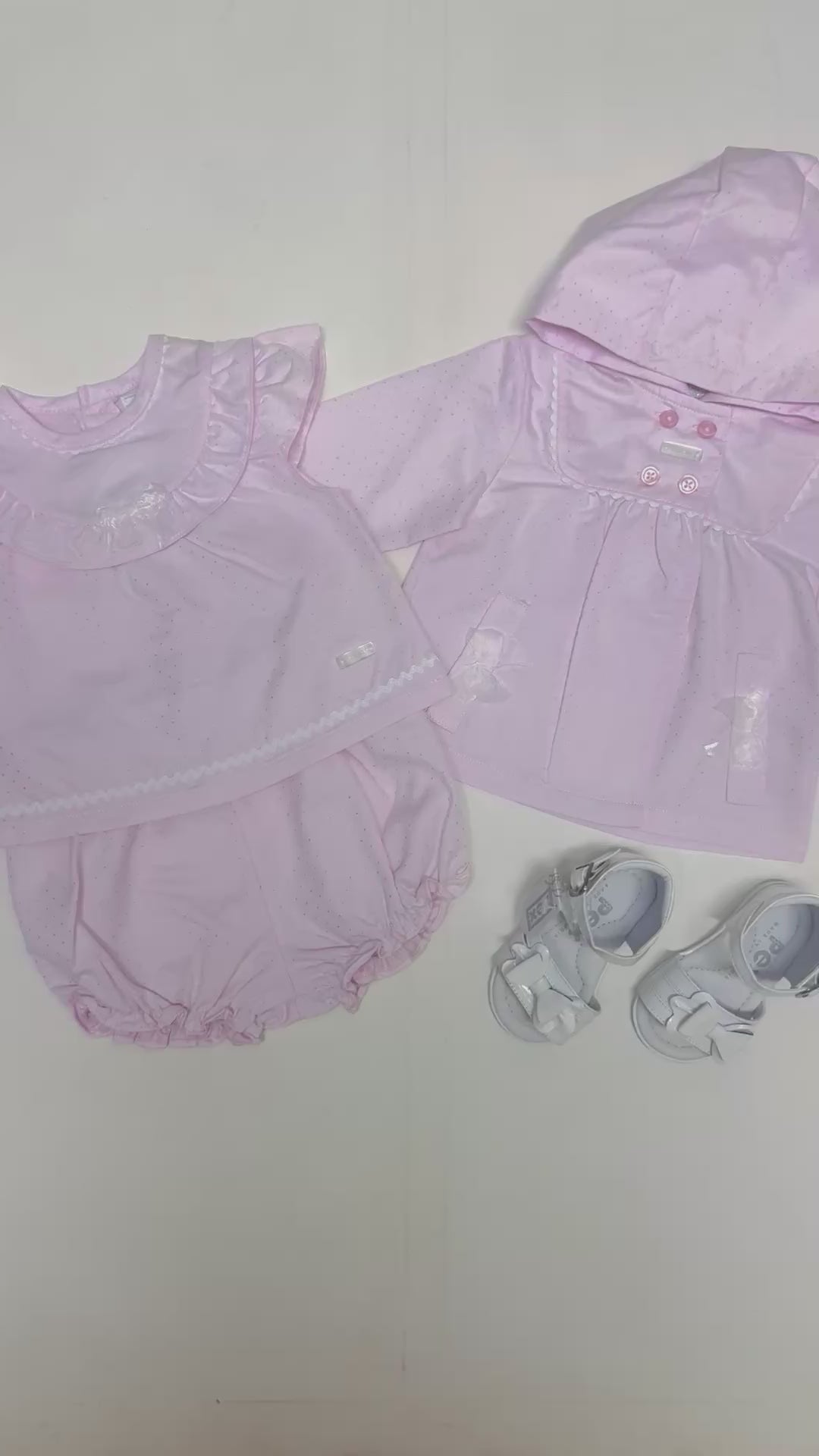 Featuring a delicate pastel pink base with subtle polka dot detailing, the sleeveless top is finished with a soft layered frill collar, scalloped trim, and a sweet bow at the neckline. The matching bloomers offer a gentle elasticated waist and leg openings, ensuring a comfortable and secure fit for little ones.