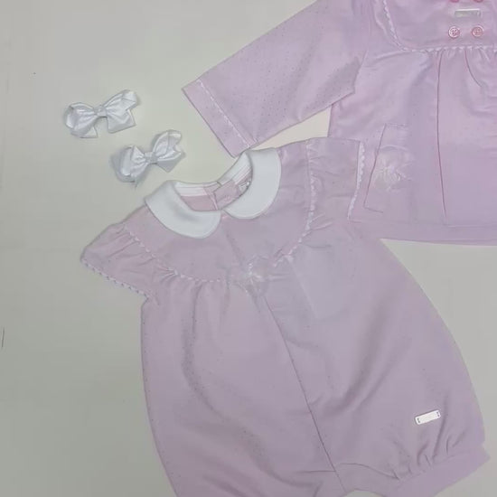 Featuring a soft pastel pink base with delicate detailing, this romper is finished with a classic white Peter Pan collar, gentle scalloped trim, and a subtle bow detail at the neckline. The sleeveless design allows freedom of movement, while the softly gathered shape and elasticated leg openings ensure a comfortable and secure fit.