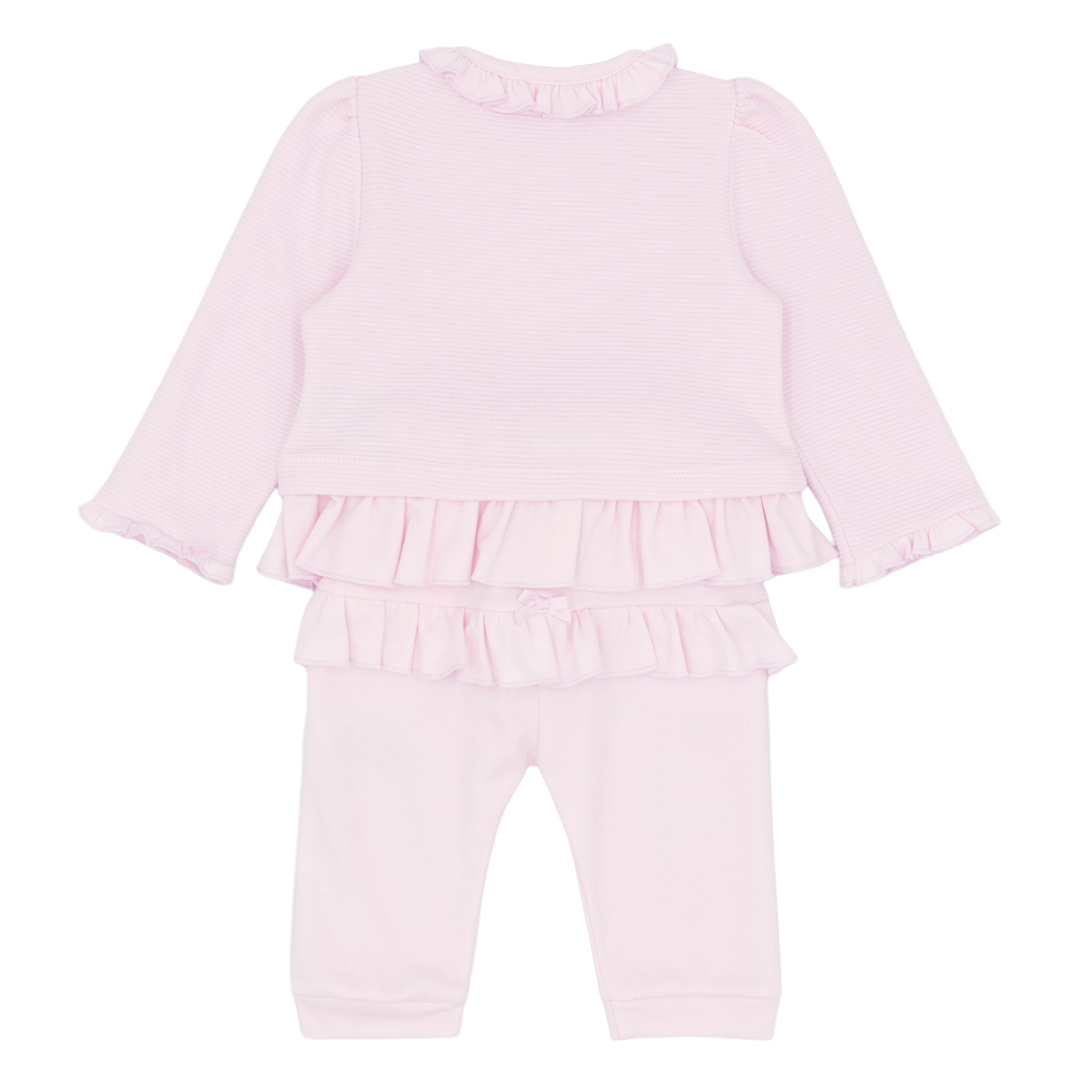 Featuring a soft ribbed long sleeve top with delicate frill detailing around the neckline, cuffs and hem, this set creates a beautiful layered look. Finished with a subtle heart charm detail and paired with matching soft leggings, it’s perfect for stylish babies who need comfort all day long.