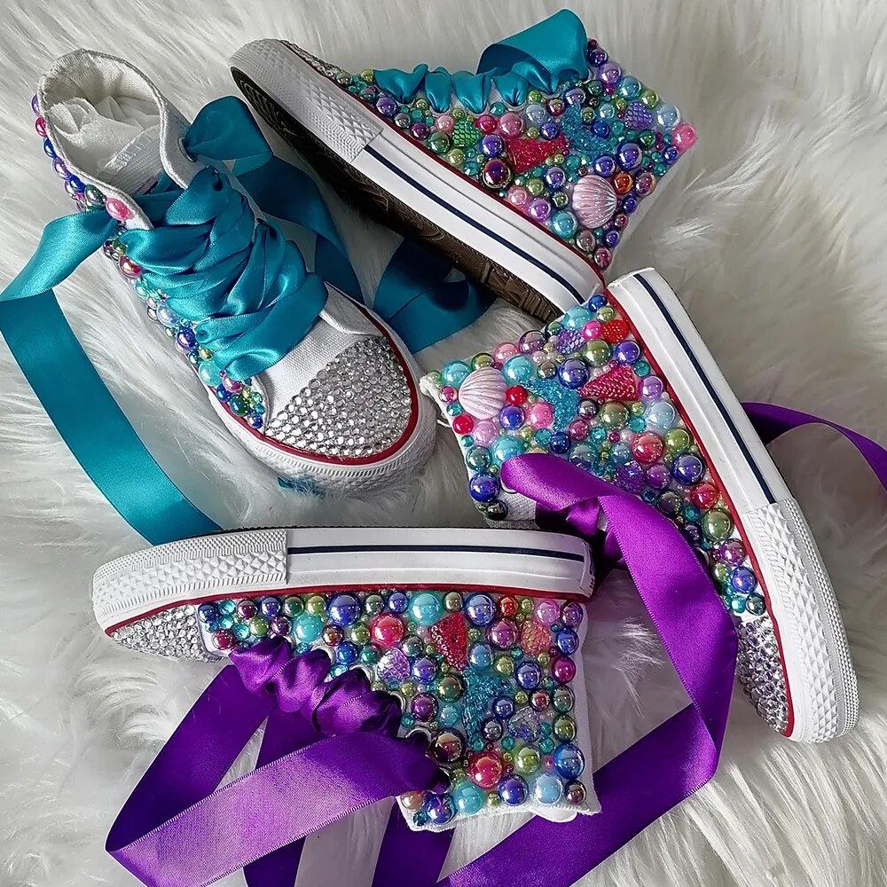 Dolly Bling Baseball Boots aqua mermaid Canvas are just too funky, made to order and finished in aqua blue with fab mermaid themed jewels with the most amazing ribbon lace.