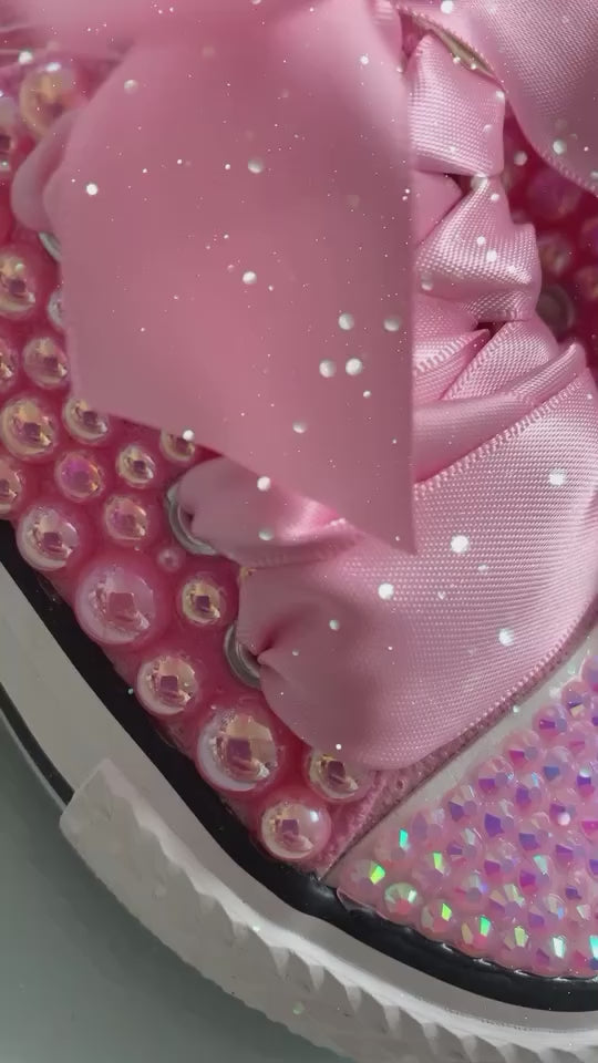 Dolly Bling Pumps in baby pink beaded Canvas are just too funky, made to order and finished with the most amazing ribbon lace.