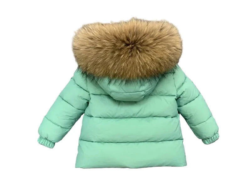 Winter Coat Mint Green High Gloss finish Natural Racoon fur Hood