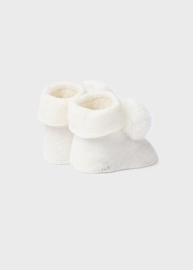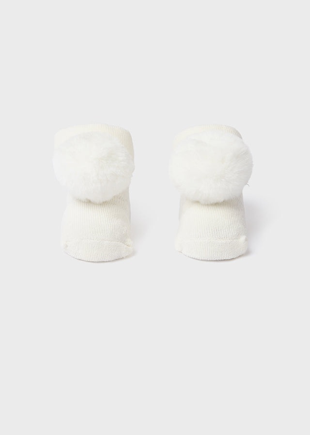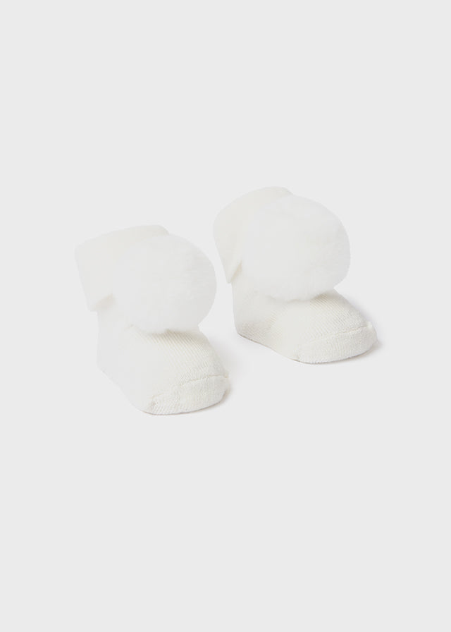 Ivory headband and socks set for baby girls by Mayoral, made from a soft and stretchy cotton blend. Ideal for completing an outfit, both pieces are finished with faux fur pom-poms for a cute and girly look. This item contains organic cotton.