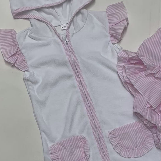 The set includes a white short-sleeve zipper hood top and ruffled pink plaid shorts, providing lightweight coverage and freedom of movement for active little girls. Designed for ages 1–5 years, it’s ideal for poolside play, beach trips, or casual summer outings.