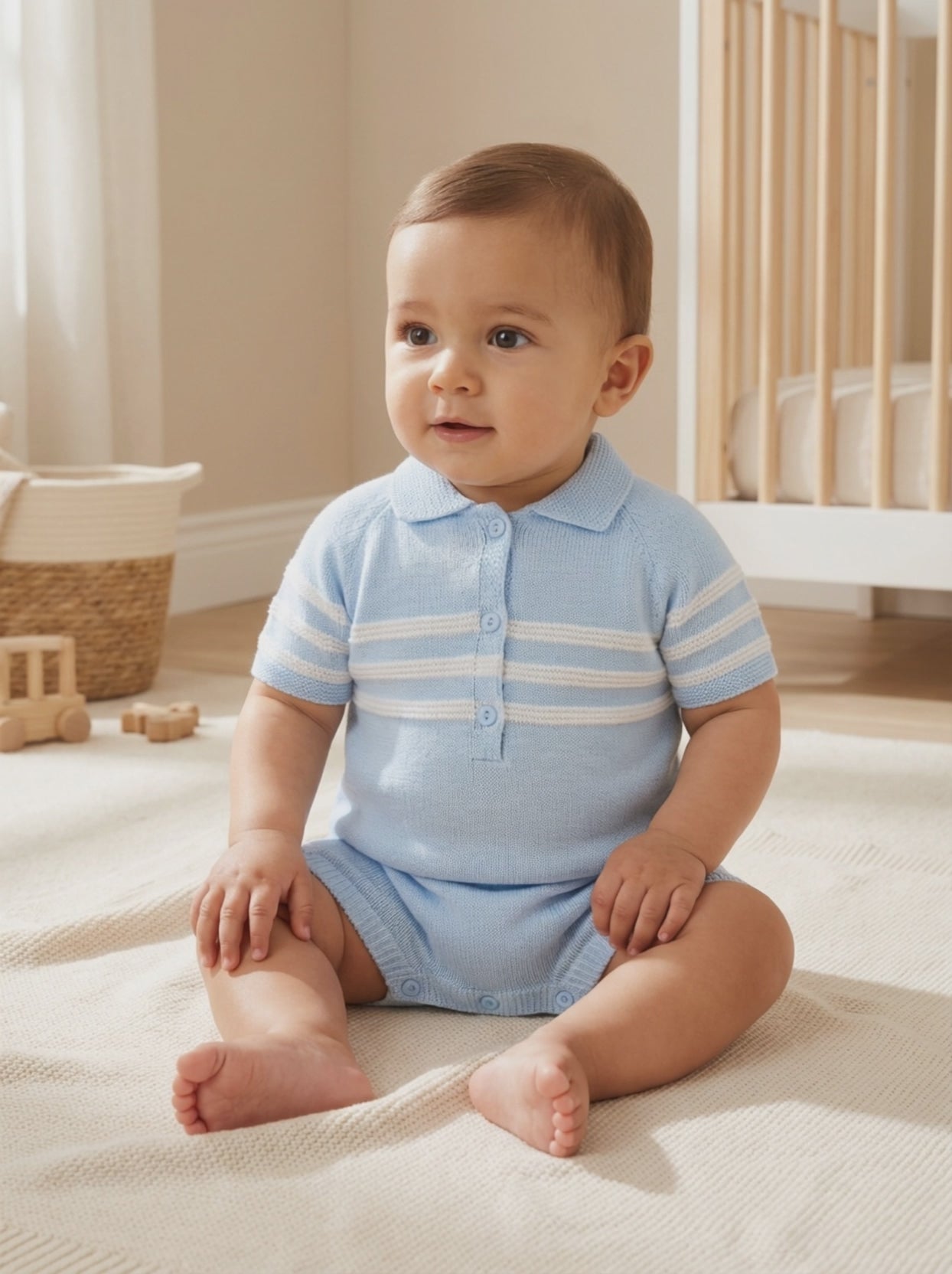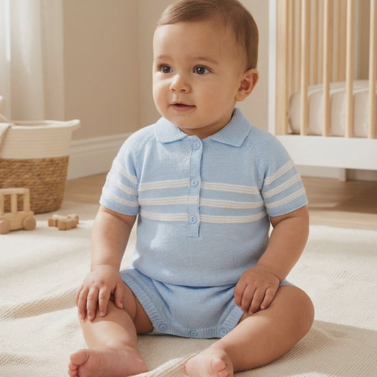 A timeless and understated knitted romper in a soft blue tone, designed with classic polo styling for a smart yet comfortable look. This beautifully crafted piece features short sleeves, a traditional knitted collar, and delicate contrast stripe detailing across the chest and sleeves.