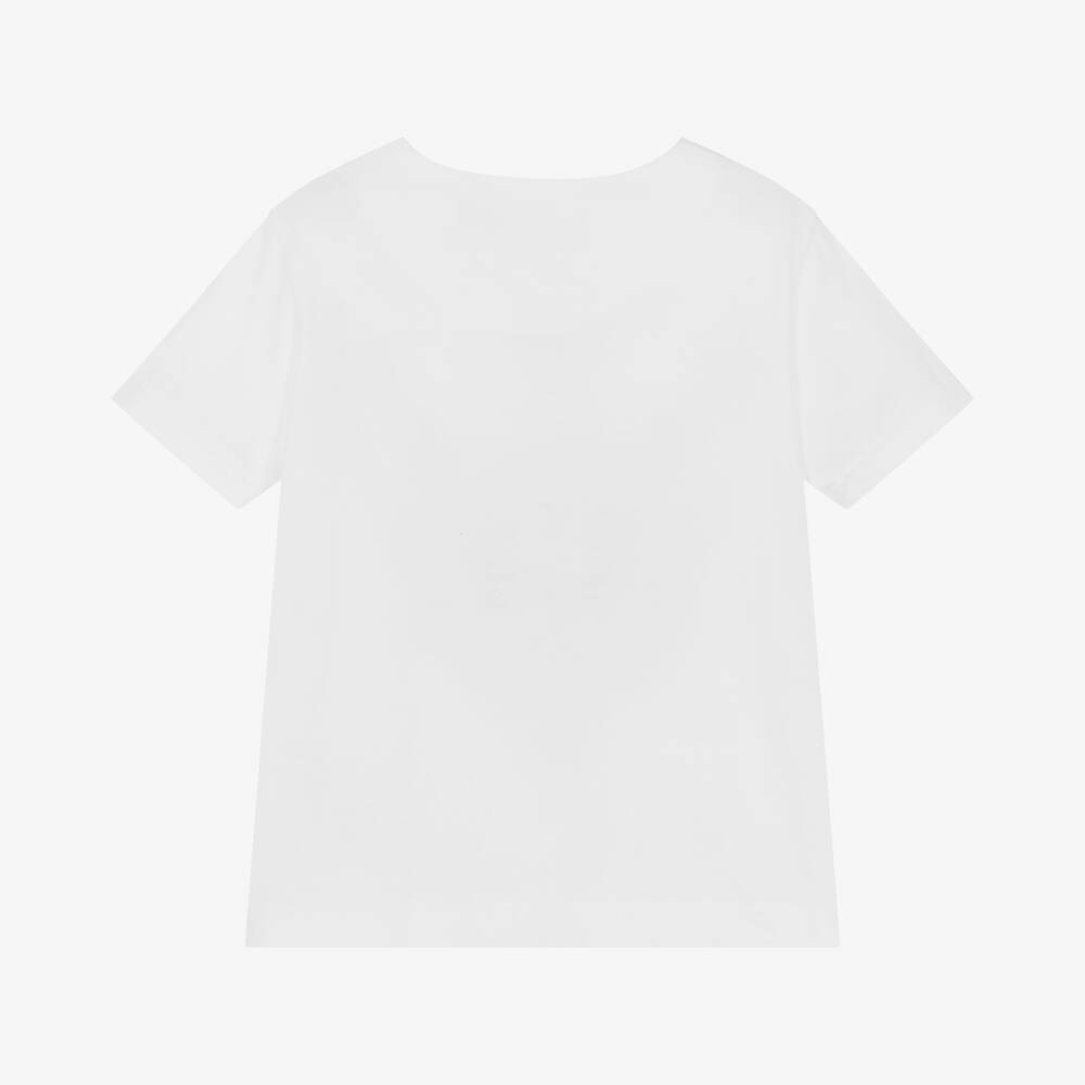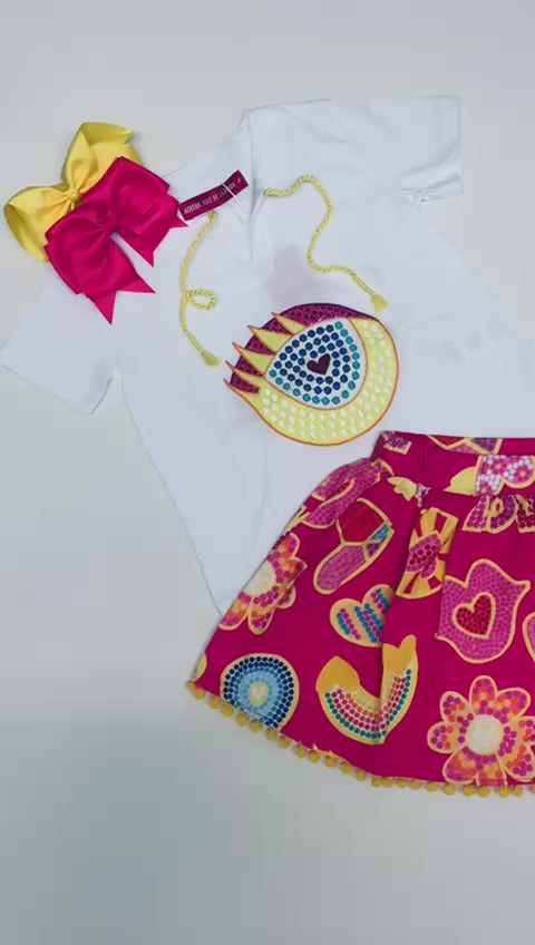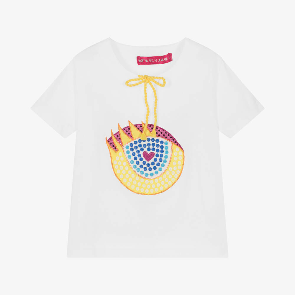 White cotton T-shirt for girls by Agatha Ruiz de la Prada, made in soft jersey with a notch neckline and yellow cord tie detail. Casual and comfortable, it has a colourful eye design on the front, with embroidered detail and shiny sequins for a touch of sparkle. Matching bright pink cotton skirt with a vibrant, Mexican-inspired pattern in yellow and blue. Made in soft, comfortable jersey with an elasticated waistband, it is full and gathered, with a fun bobble trim around the hemline.