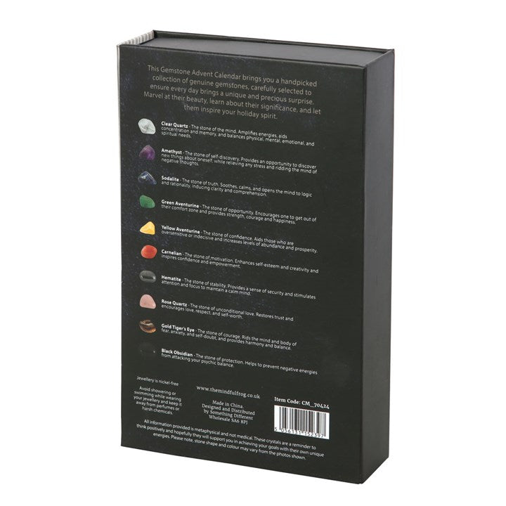 Celebrate the countdown to Christmas with the crystal necklace advent calendar. This beautiful advent calendar includes an interchangeable necklace with 10 different gemstones and a handy storage bag. Each day reveals a new gemstone to add to your collection. The gemstones featured in this advent calendar are clear quartz, amethyst, sodalite, green aventurine, yellow aventurine, carnelian, hematite, rose quartz, gold tiger's eye and black obsidian. Size, shape and colour of stones may vary, making each crystal unique.