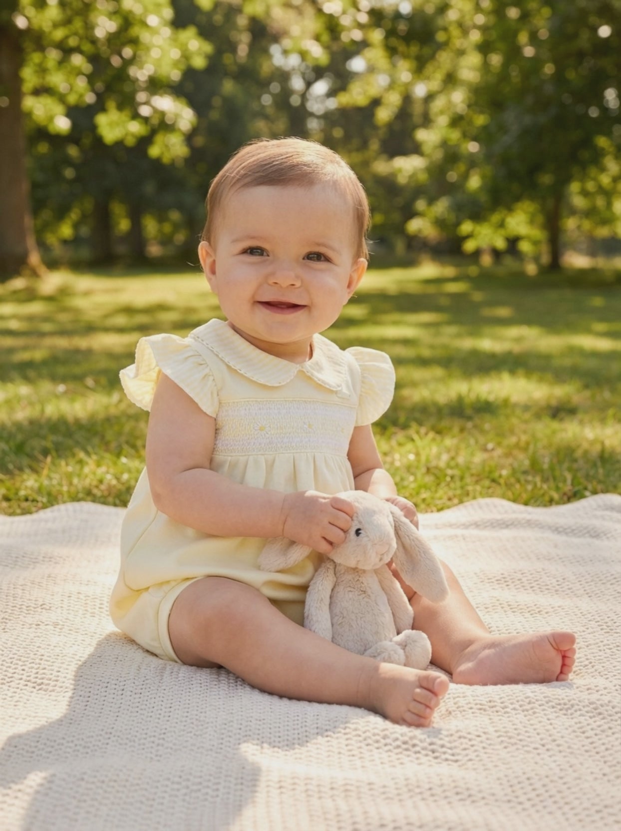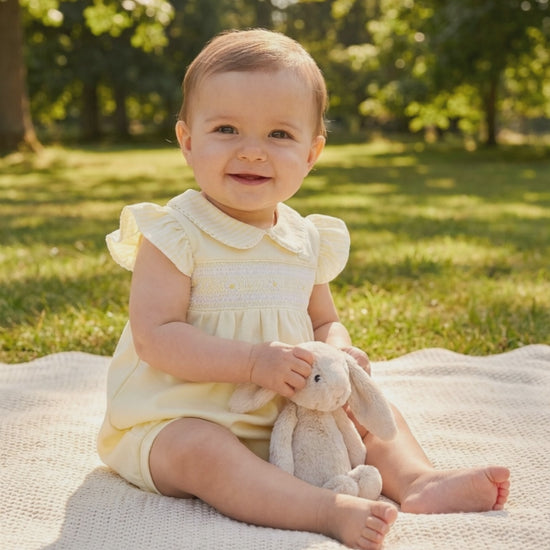 This beautifully crafted baby romper features delicate yellow smocking across the chest with subtle embroidered detailing. Finished with flutter frill sleeves and a classic rounded collar, it offers a timeless and elegant look. Soft and lightweight, this romper is ideal for warm days, special occasions or a refined everyday outfit.