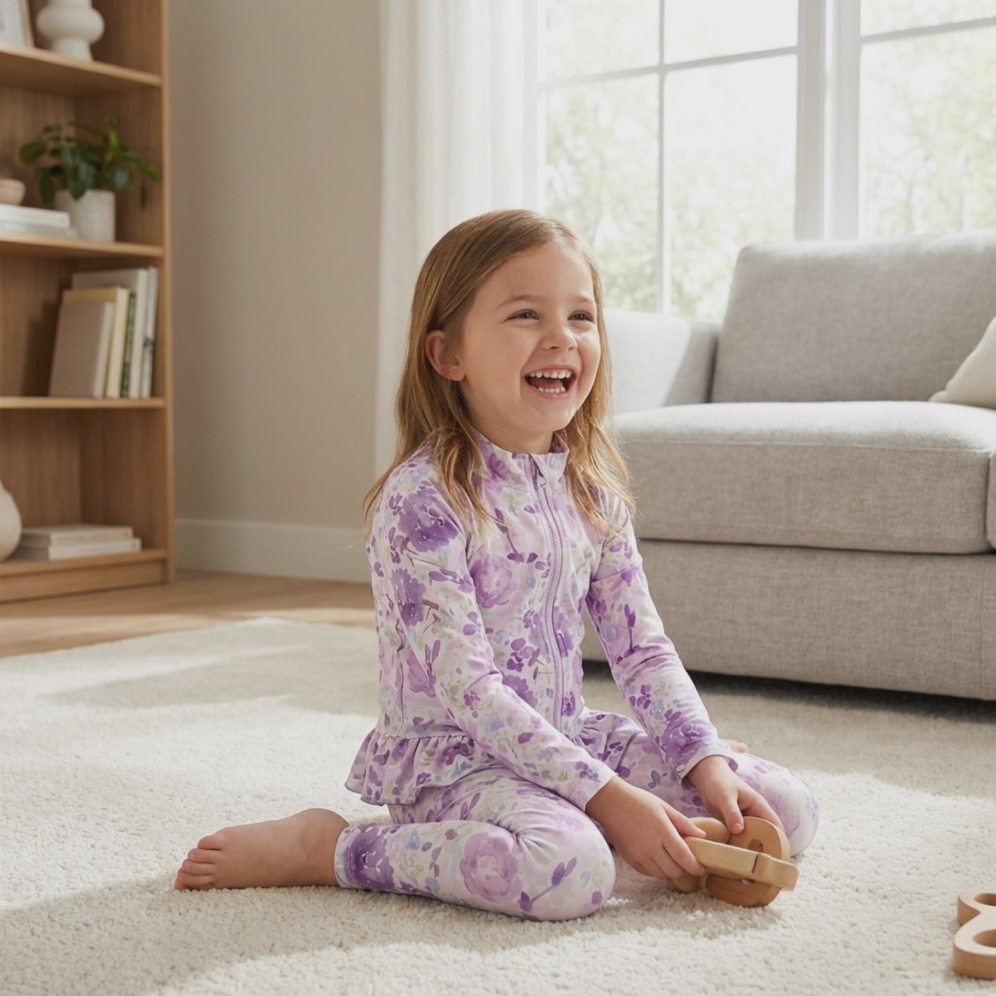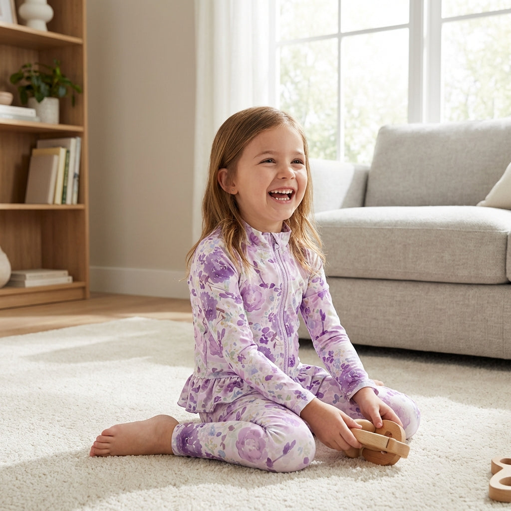 Crafted from a soft, breathable stretch fabric, the delicate lilac floral print with hints of burgundy and green gives this outfit a premium boutique feel. Ideal for casual days, travel, or dressy lounge wear, it offers both flexibility and durability for active little ones.