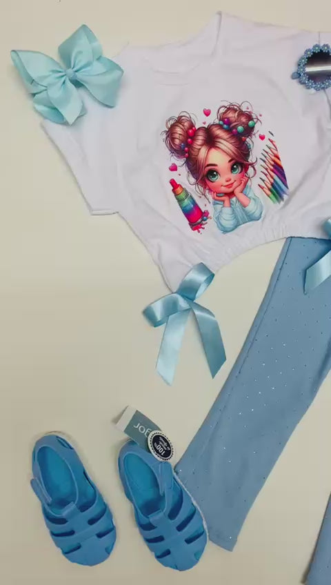 Kids girls angel sky blue print motif short sleeve bow top co-ord with matching trousers set.