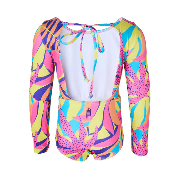 Our luminous leaves girls long sleeved swimming costume features an open back with tie.  This print is available in a rashguard, swimming costume, bikini and boys swim shorts so that siblings and family members can make that matching statement.  Made from Econyl and printed with eco-friendly ink - made to last!  The fabric is super soft and comfortable and our printed care label ensures there are no itchy labels.  It's also UPF50+.