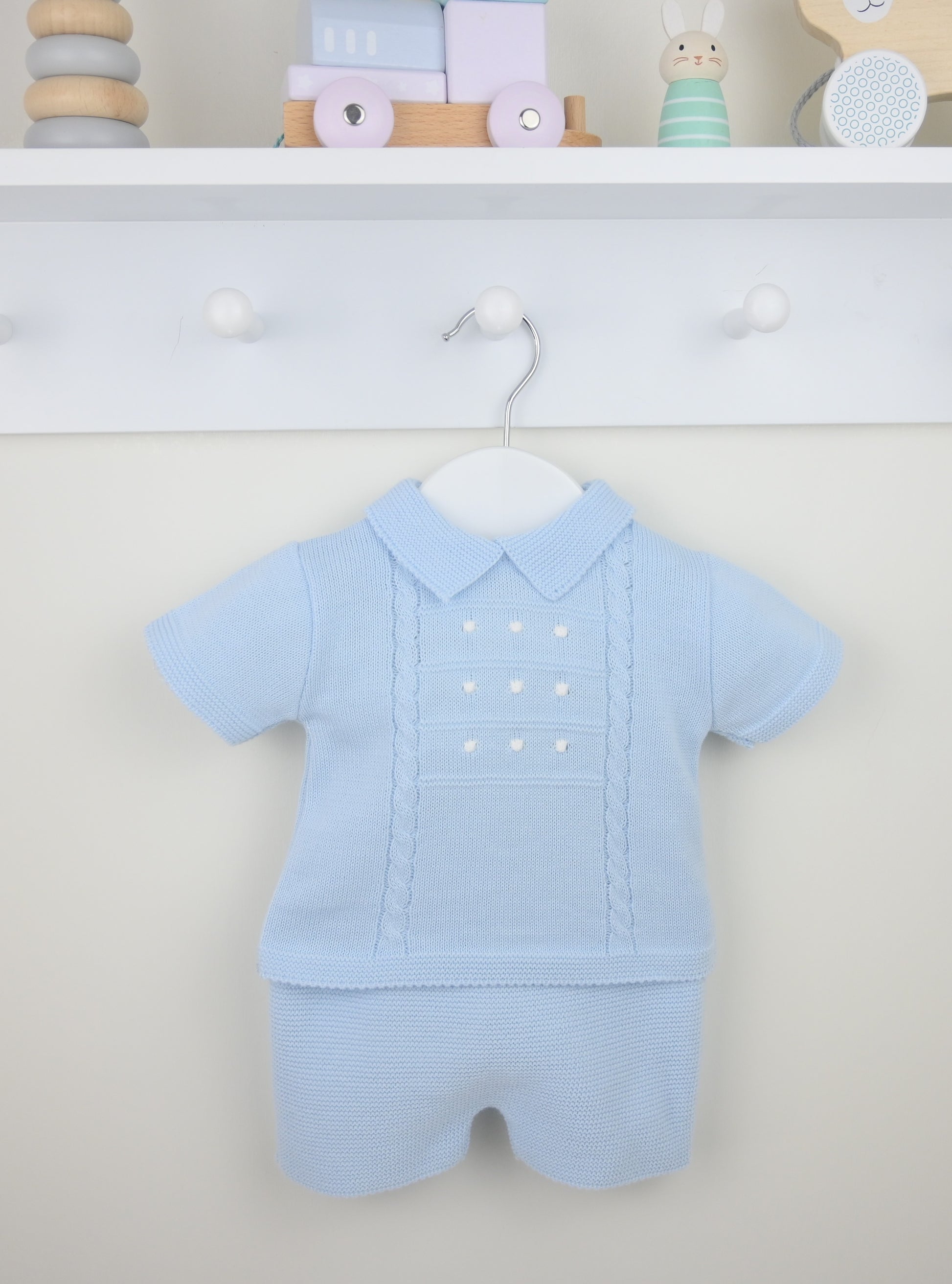 A beautifully crafted knitted shorts suit in a soft natural tone, designed for a timeless and elegant baby look. The short-sleeved knitted top features a classic knitted collar, delicate cable detailing, and raised dot accents across the front, adding texture and traditional charm.